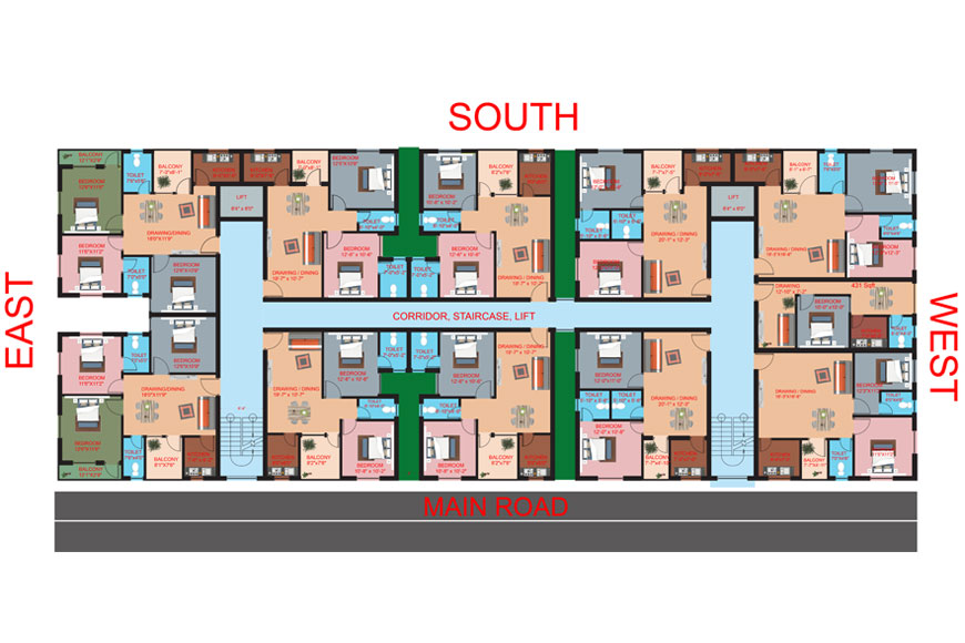 1 acres having 1 elegant tower (S+4 Floors) and total of 44 (1/2/3 BHK) 3 side Open apartments,with Garden & Main Road Facing.